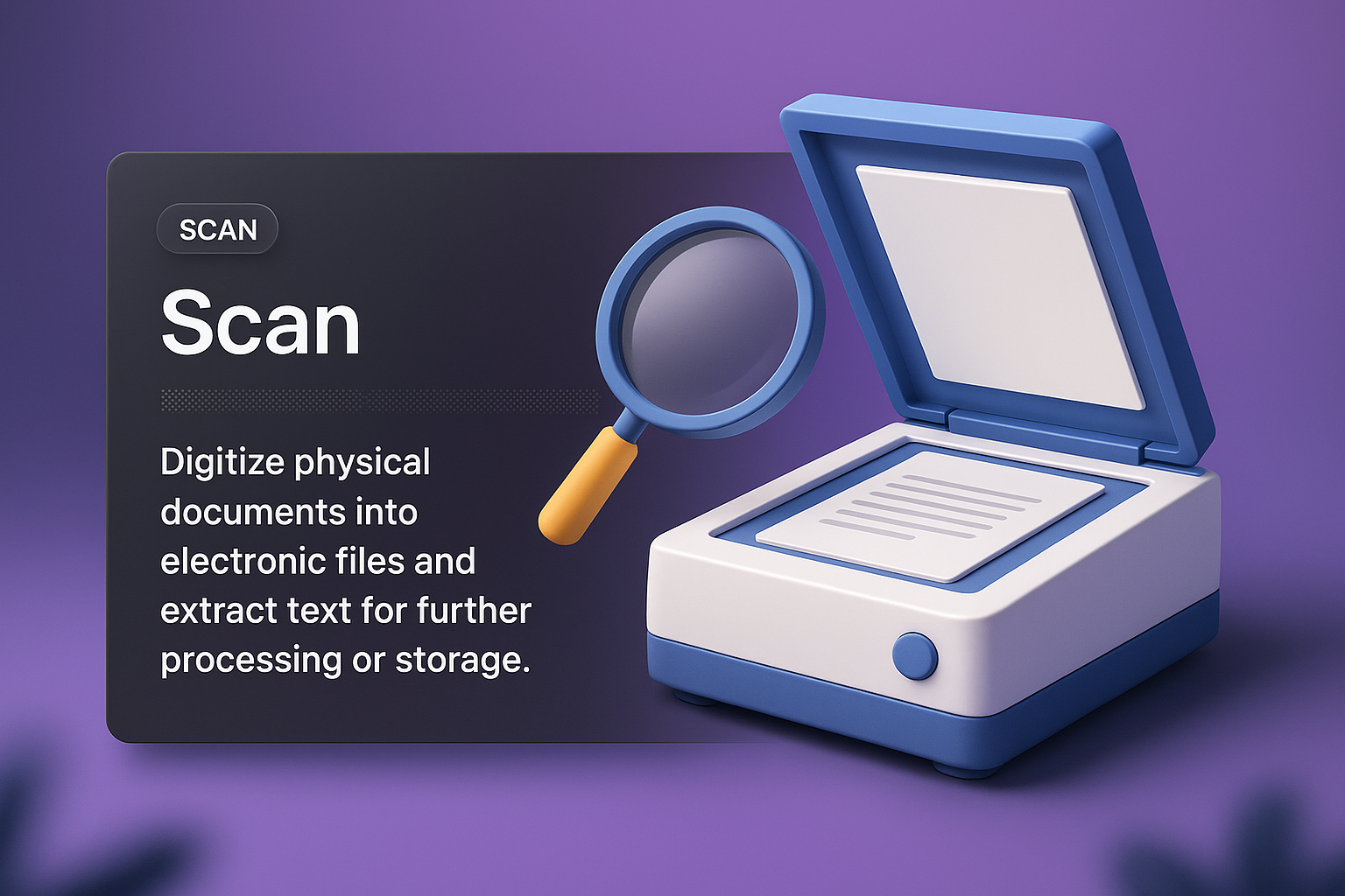 /Collection: /by davooda/Type: PNG/A visually engaging 3D illustration of a scanner, integrated with a dark label block. The design showcases the scanner's functionality with clear text, ideal for web page presentation.