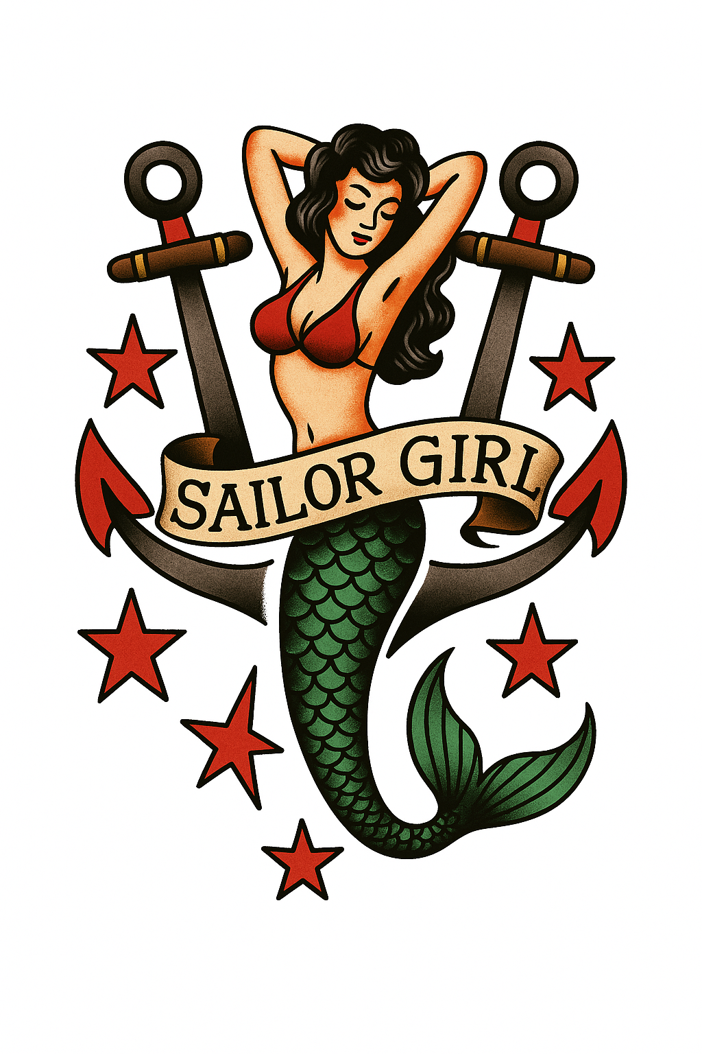 /Collection: /by davooda/Type: PNG/Vibrant tattoo design showcasing a sailor girl with a mermaid tail, flanked by anchors and stars, ideal for tattoo art enthusiasts and maritime-themed artwork.