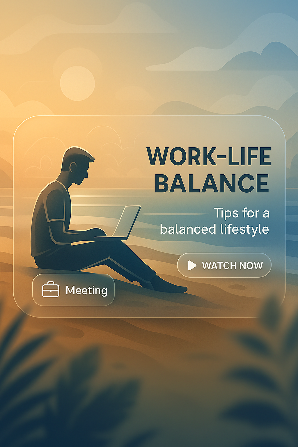 /Collection: /by davooda/Type: PNG/A serene and motivational graphic illustrating a person working on a laptop by the beach at sunset, promoting a balanced lifestyle. Ideal for wellness or professional development content.