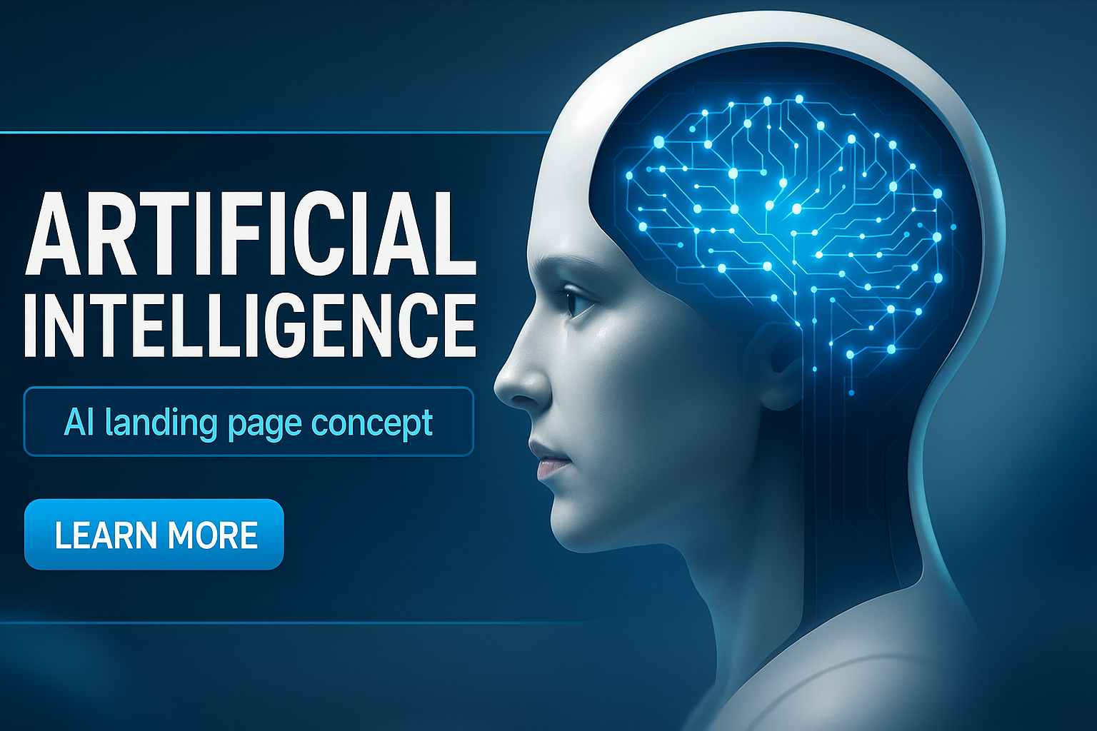 /Collection: /by davooda/Type: PNG/Modern landing page design concept for Artificial Intelligence, featuring a stylized human profile with a digital brain illustration. Ideal for tech-related marketing.