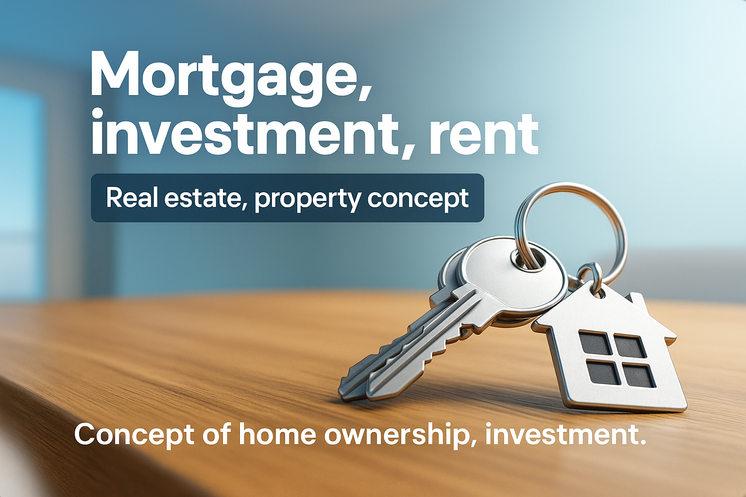 /Collection: /by davooda/Type: PNG/A close-up view of keys on a wooden table, symbolizing mortgage and real estate investment. The background features a soft gradient, enhancing the theme of home ownership.