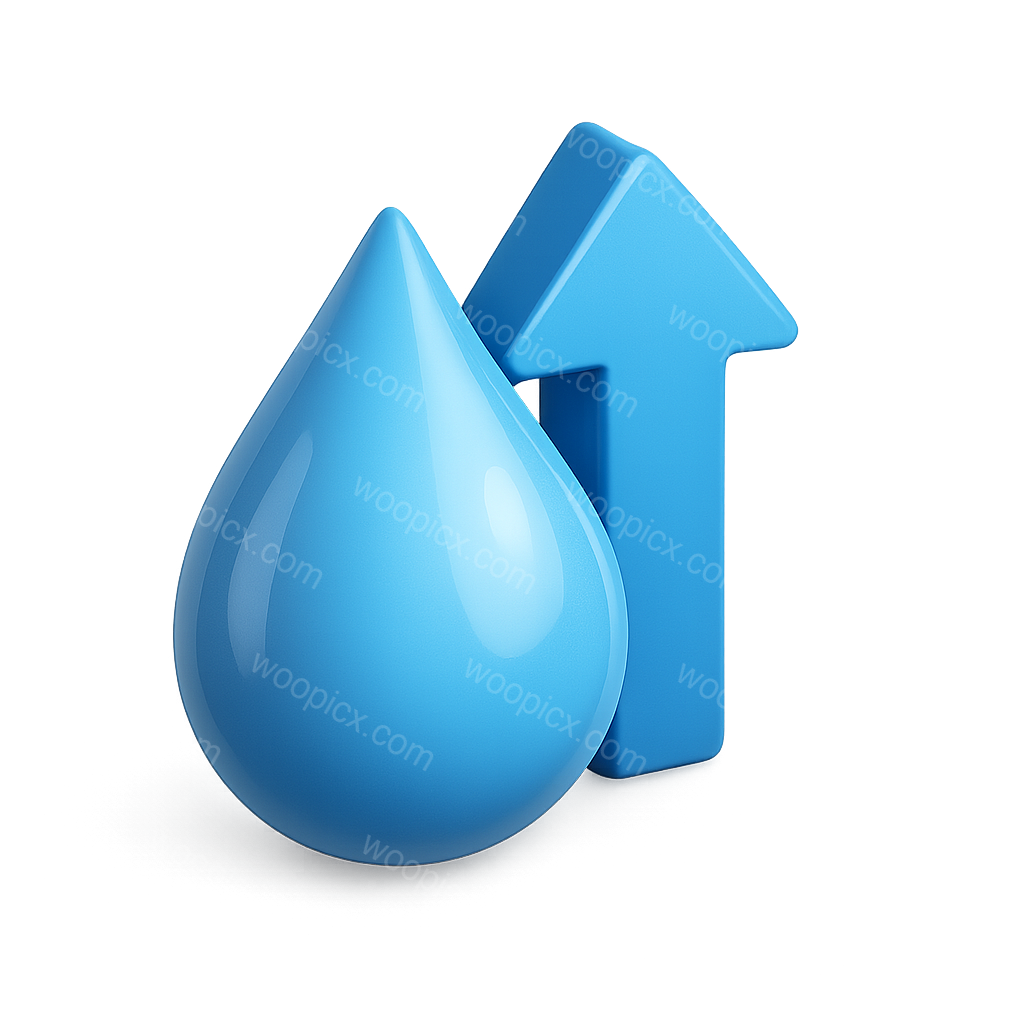 A stylized 3D representation of a water drop alongside an upward arrow, both in a glossy blue finish. The icon is designed with a transparent background, showcasing a three-quarter view for depth.