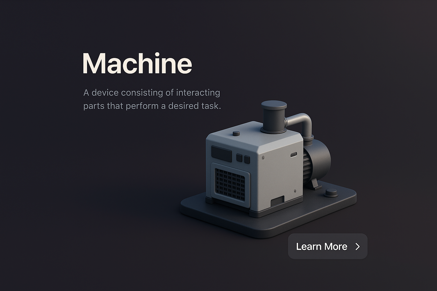 A detailed 3D representation of a machine set against a dark gradient background. The scene features a small machine with text elements that are clearly readable, emphasizing realism.