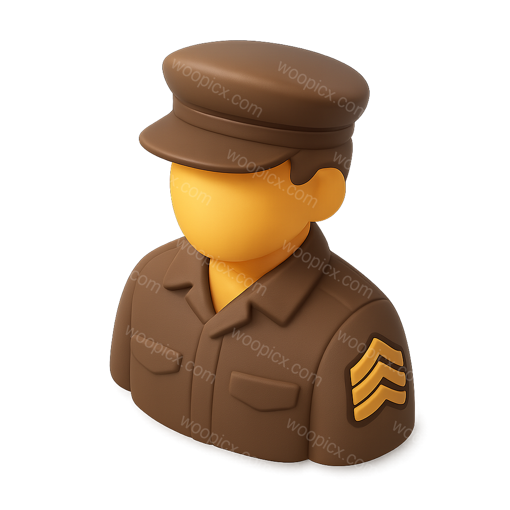 A stylized 3D icon of a sergeant featuring distinct chevrons on the uniform, viewed from a three-quarter angle. The design includes a brown military hat and shirt, emphasizing a modern, isometric style.