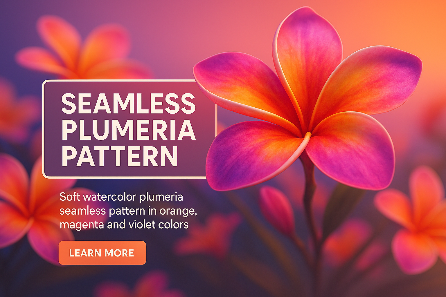 A stunning seamless pattern design featuring soft watercolor plumeria flowers in vibrant orange, magenta, and violet hues, ideal for textile or wallpaper design.