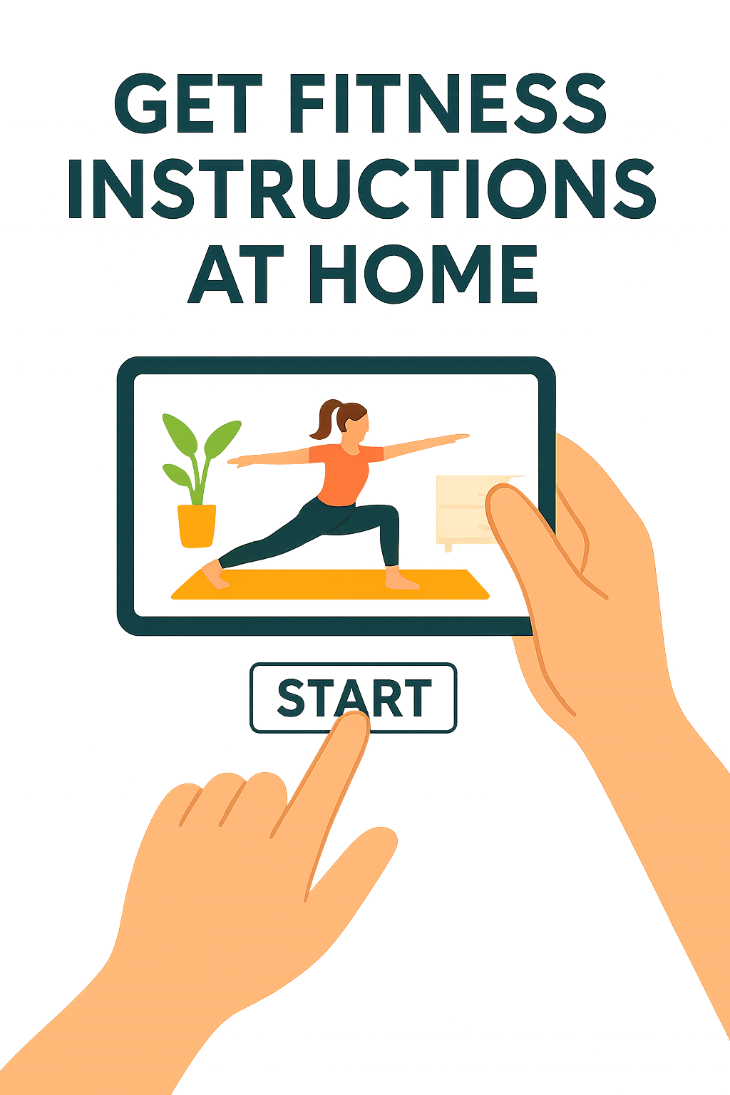 /Collection: /by davooda/Type: PNG/A vibrant illustration promoting home fitness instructions, featuring a hand holding a smartphone displaying a yoga pose. Ideal for fitness apps or online workout platforms.