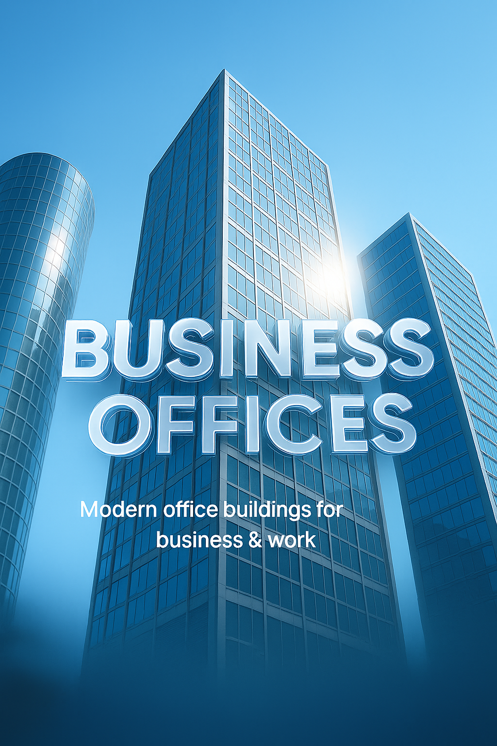 /Collection: /by davooda/Type: PNG/A striking view of modern high-rise office buildings against a bright blue sky. The dynamic angle showcases the sleek architecture, emphasizing the clean lines and glass facades of the skyscrapers.