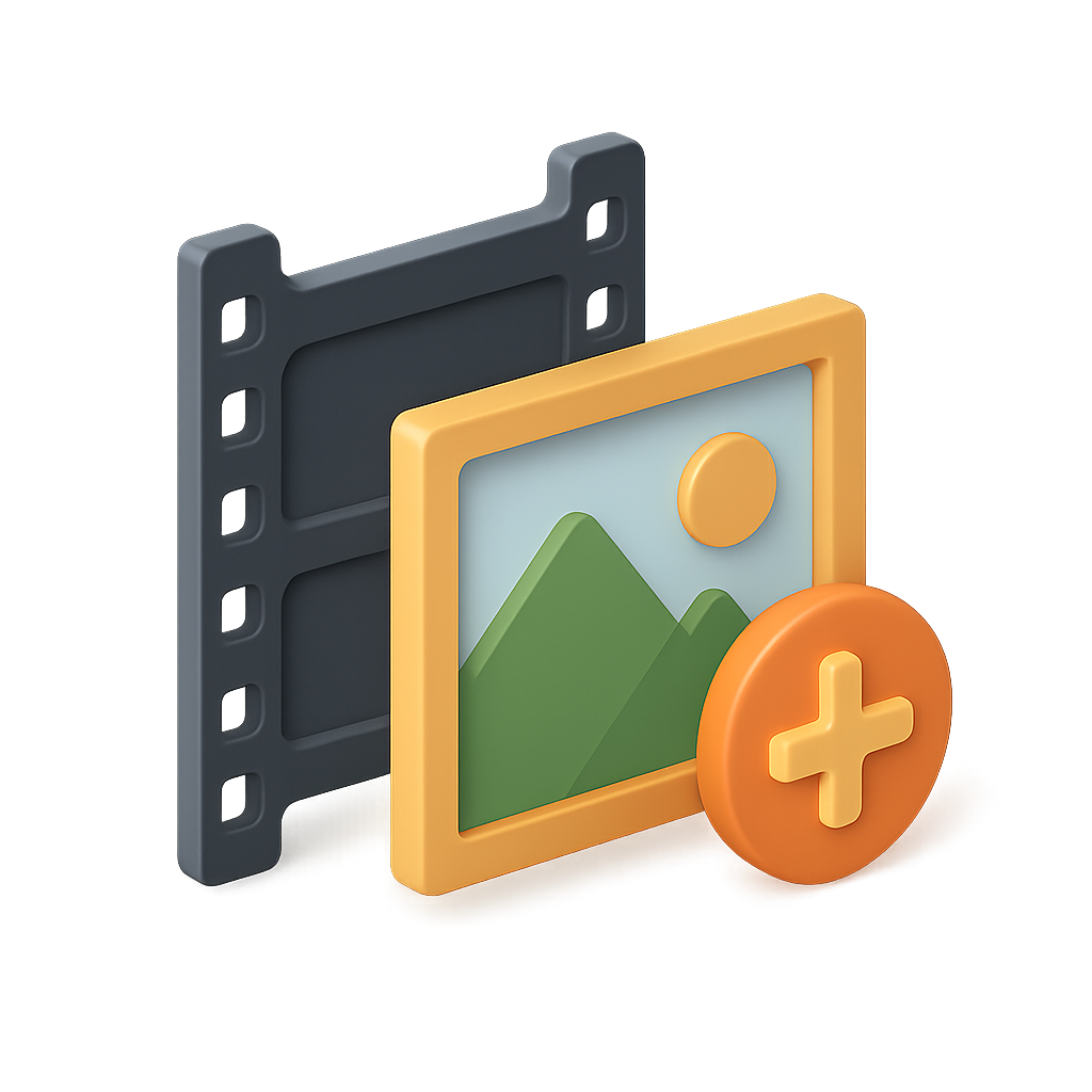 /Collection: /by davooda/Type: PNG/A 3D representation of a filmstrip alongside a picture frame featuring a mountain scene, highlighted with a plus sign, all rendered in vibrant colors and an isometric view.