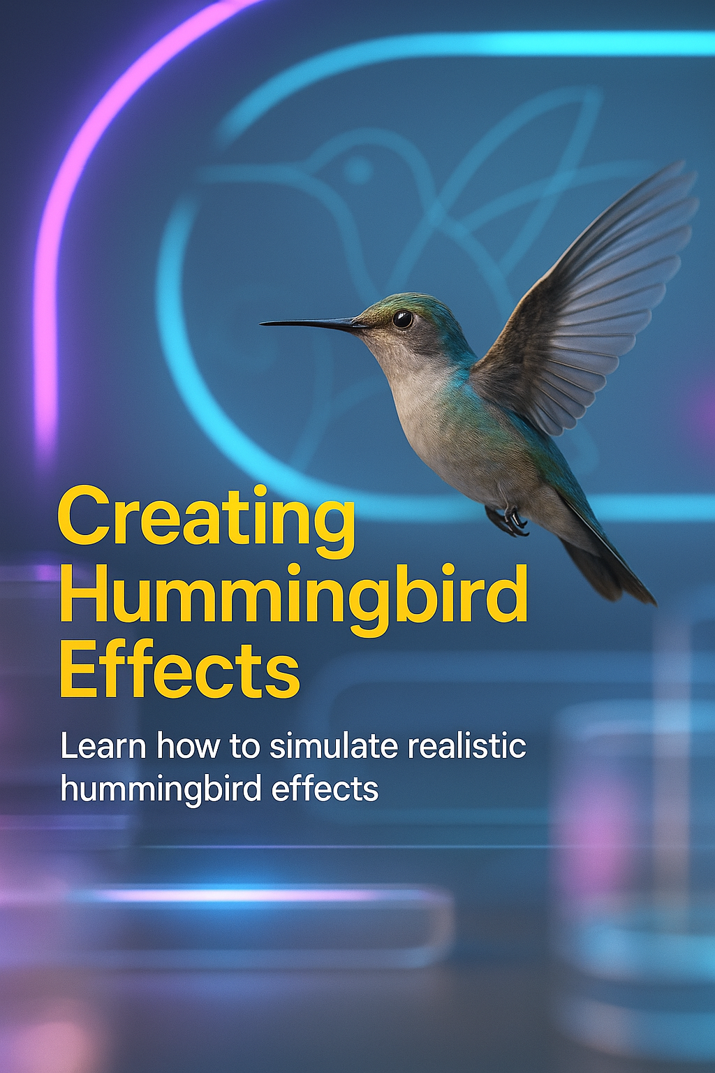 A visually appealing graphic promoting a tutorial on simulating realistic hummingbird effects, featuring a vibrant design and a realistic hummingbird illustration.