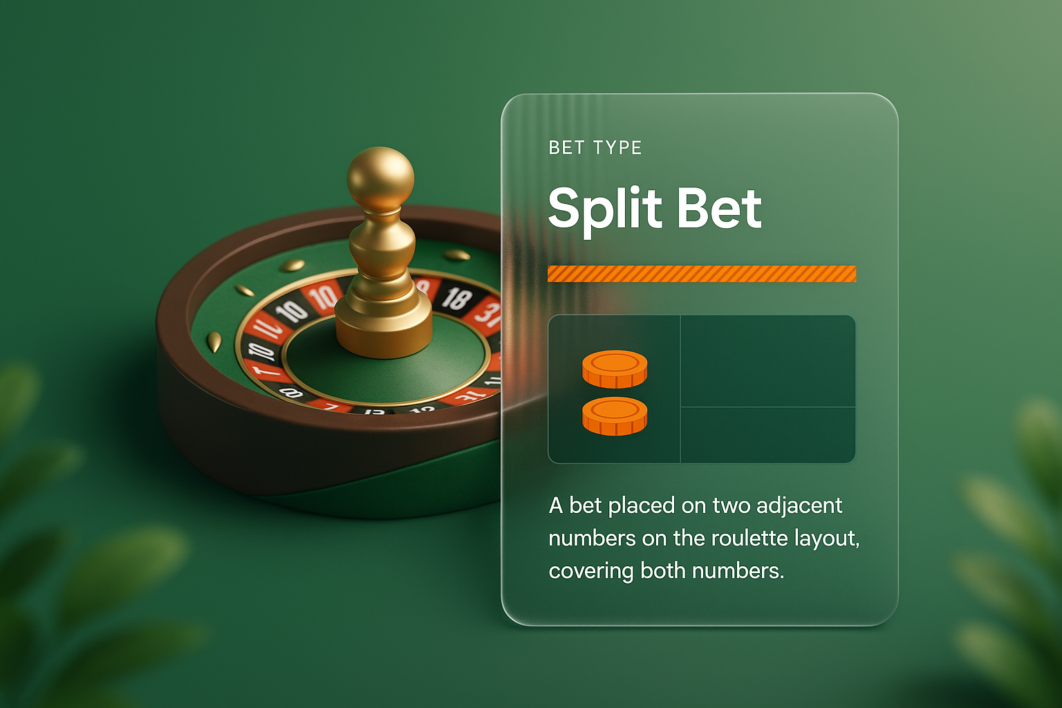 A detailed 3D illustration showcasing a split bet on a roulette table. The design features a roulette wheel, with chips and an informative card highlighting the bet type.