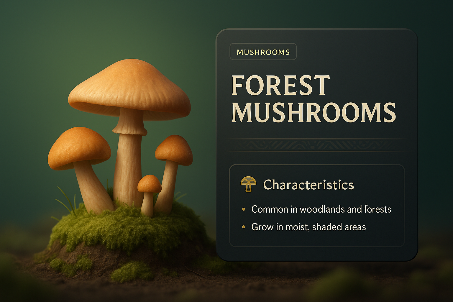 /Collection: /by davooda/Type: PNG/A stunning 3D illustration of forest mushrooms, showcasing their natural habitat. Includes a dark banner with characteristics and additional graphics, enhancing the visual appeal.