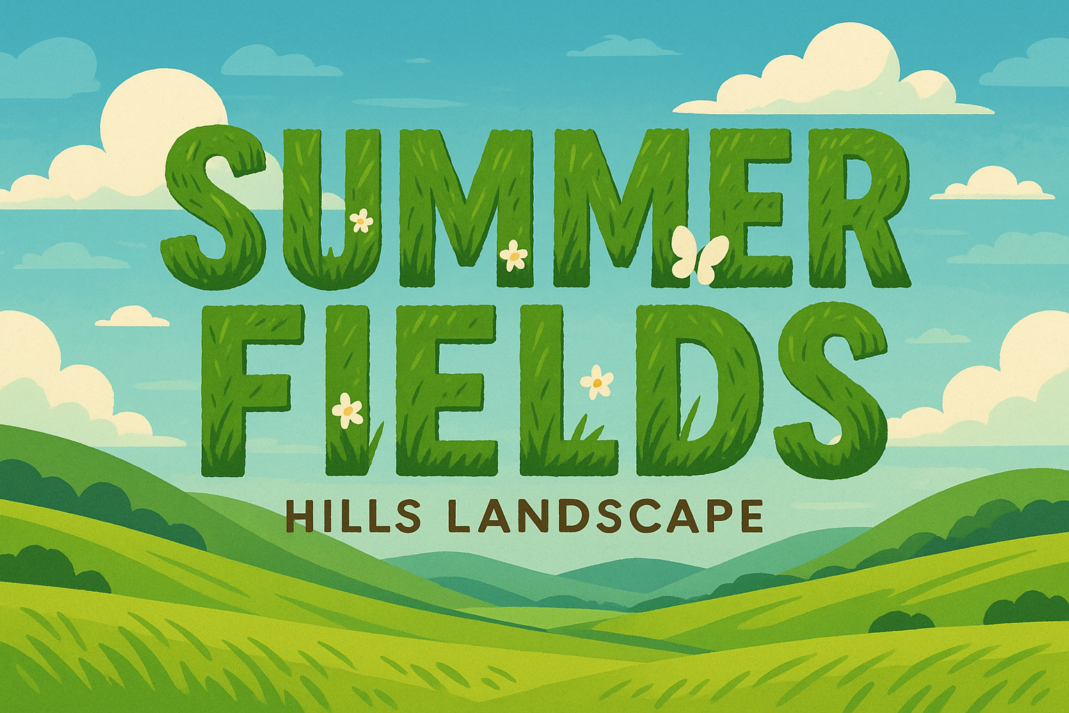 Colorful illustration of rolling hills under a bright sky, featuring playful typography. Ideal for outdoor-themed promotions or events.
