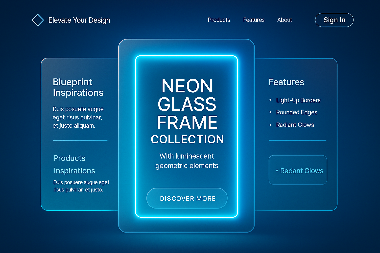 A modern landing page featuring neon glass frames with glowing geometric elements. The design includes a bold headline, call-to-action button, and sections for products and features.