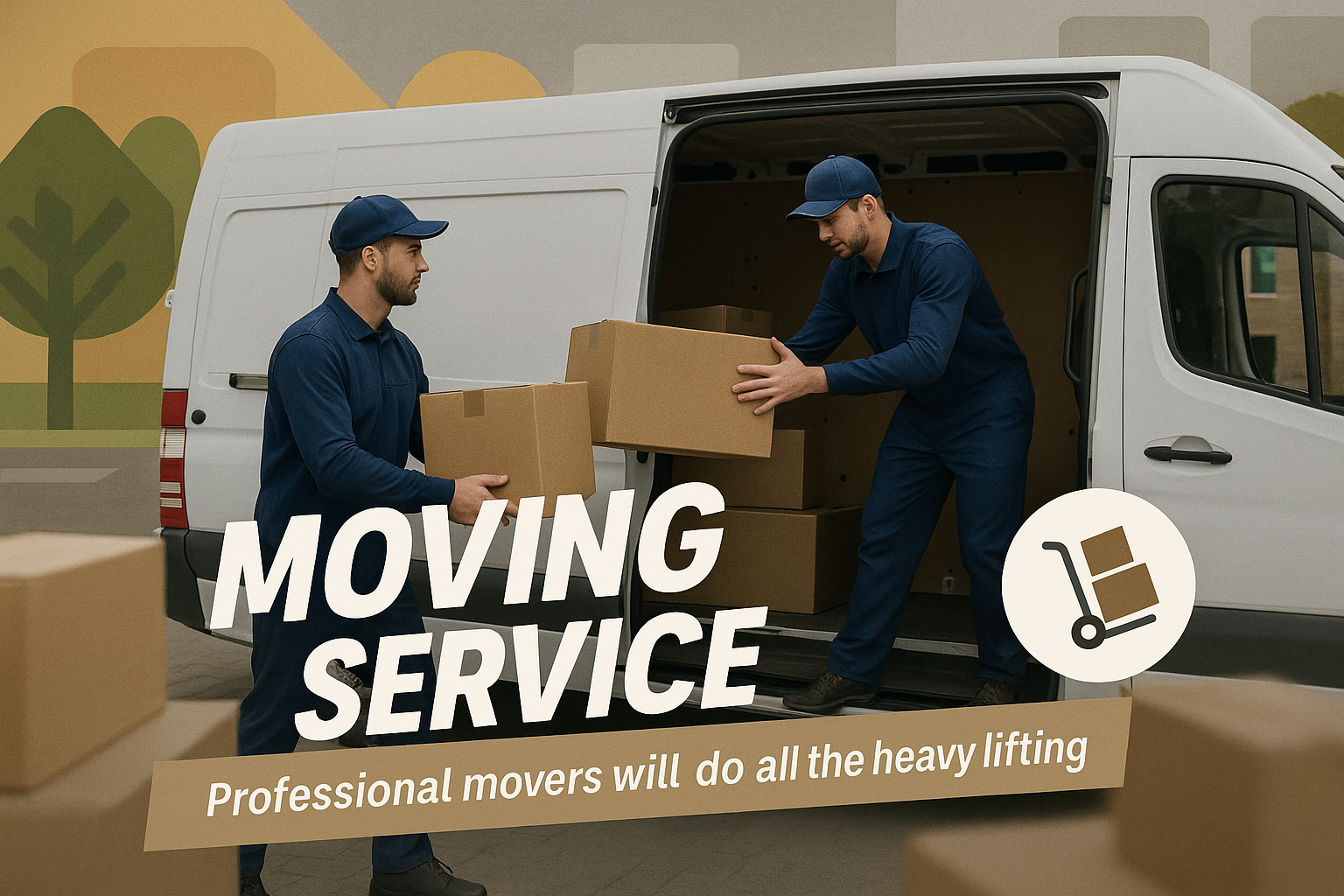 Dynamic promotional image featuring professional movers loading boxes into a van, ideal for moving service advertisements or business marketing.