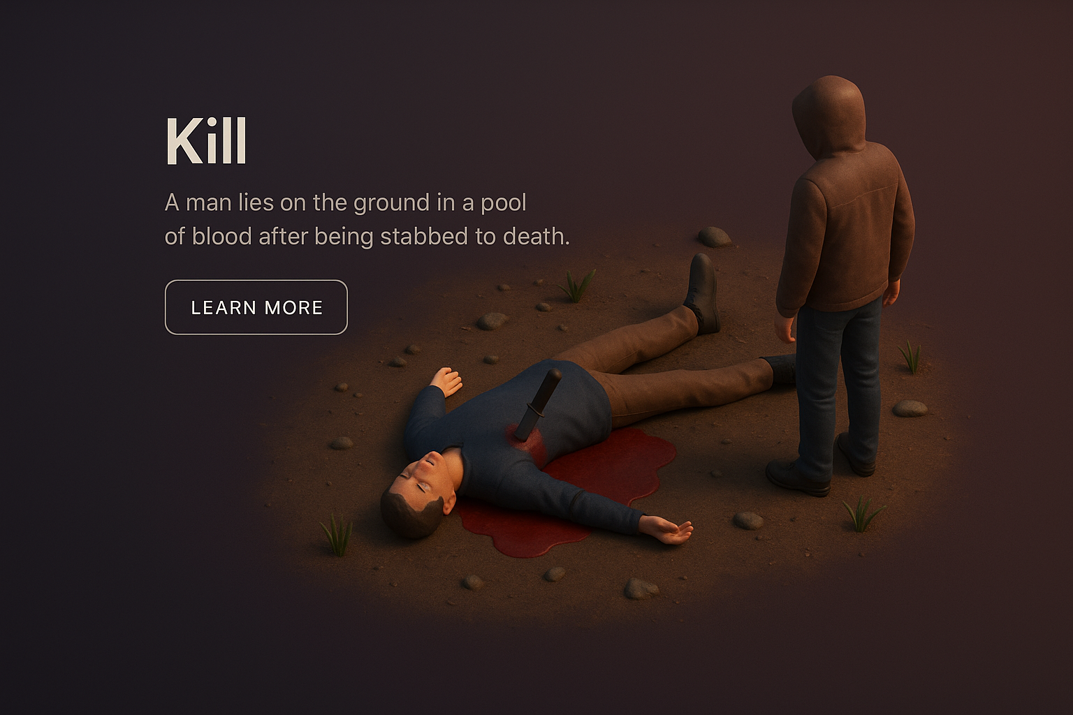 /Collection: /by davooda/Type: PNG/A zoomed-out 3D scene showcasing a crime scene with a man lying in a pool of blood, and a hooded figure standing nearby. The dark background enhances the dramatic effect.