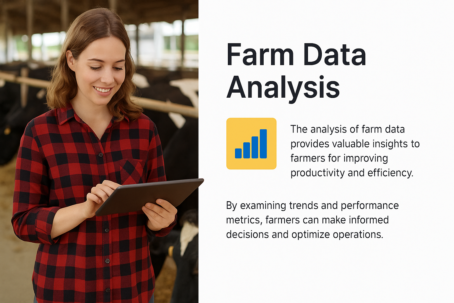 Informative graphic showcasing farm data analysis with a smiling woman using a tablet, ideal for agricultural technology marketing.