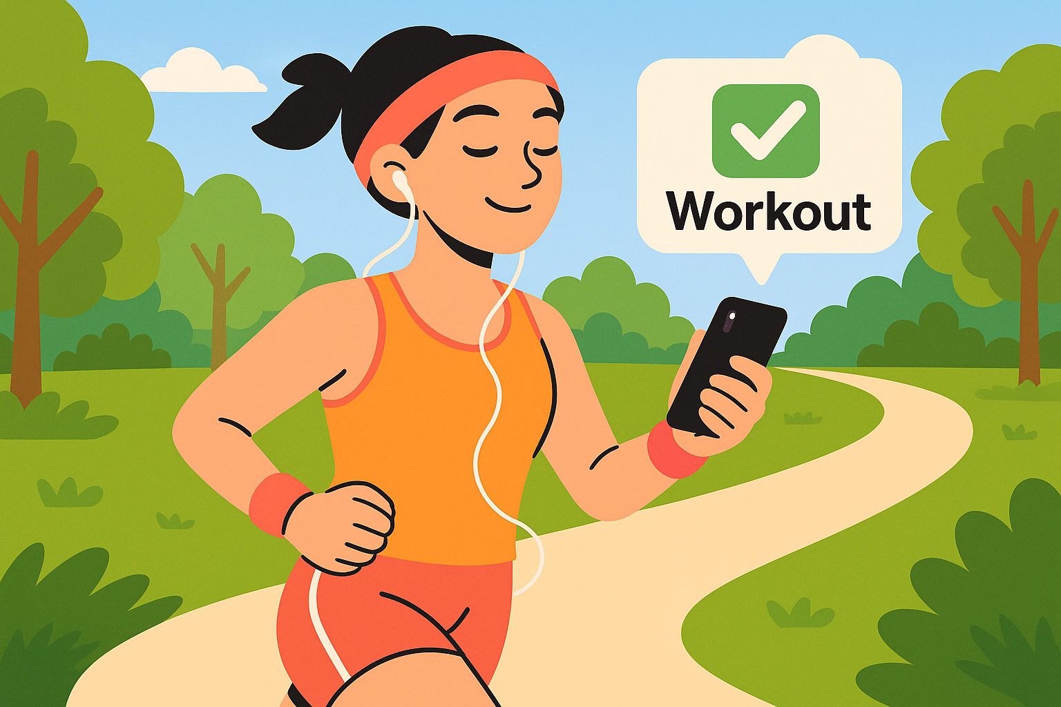 /Collection: /by davooda/Type: PNG/A vibrant and cheerful illustration depicting a woman jogging in a natural setting while listening to music on her smartphone, ideal for fitness and wellness content.