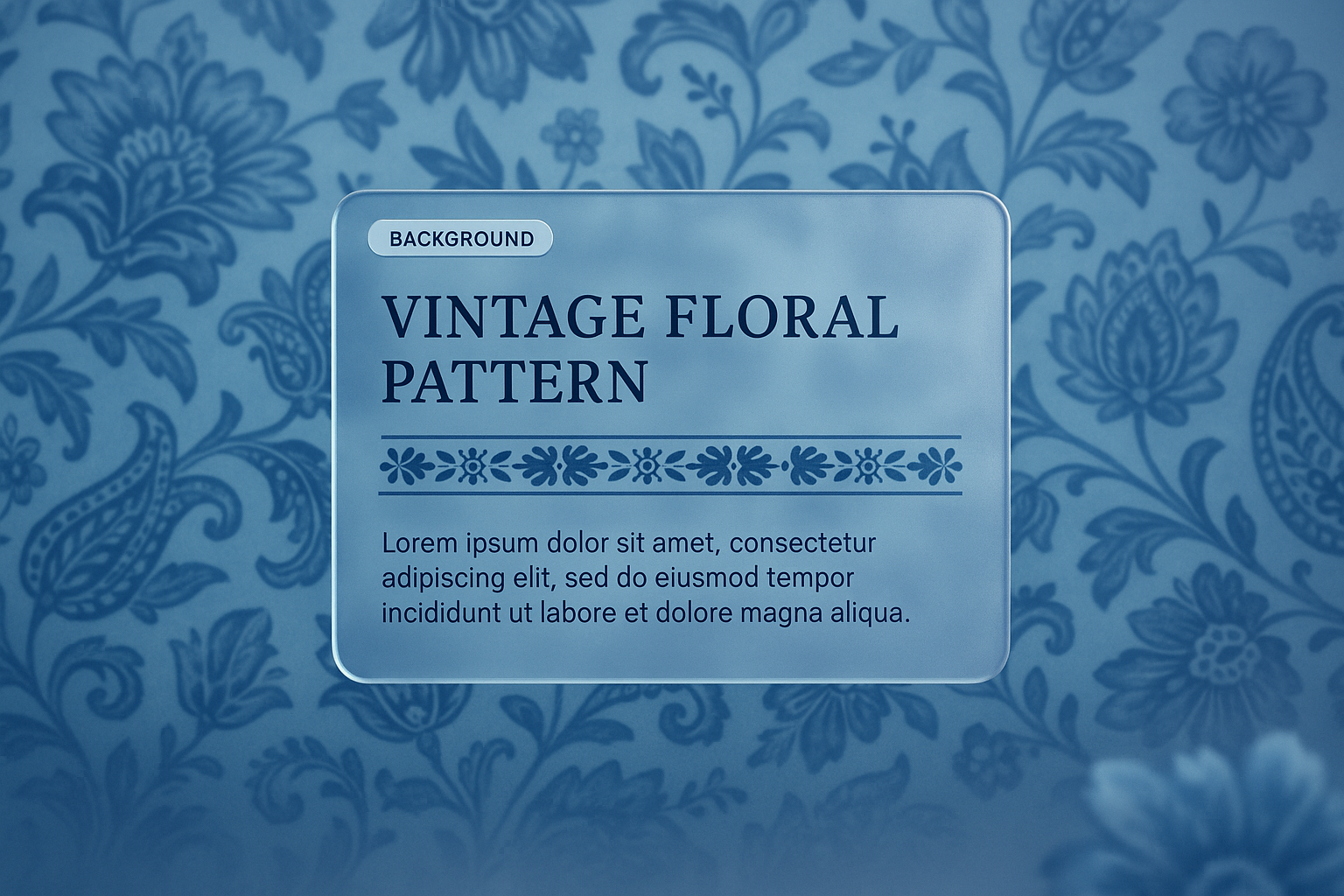 /Collection: /by davooda/Type: PNG/A seamless vintage floral batik pattern showcases intricate flower motifs and paisley designs in a soft blue silhouette. The overlay features a modern text block with a transparent glass effect, enhancing the overall aesthetic.