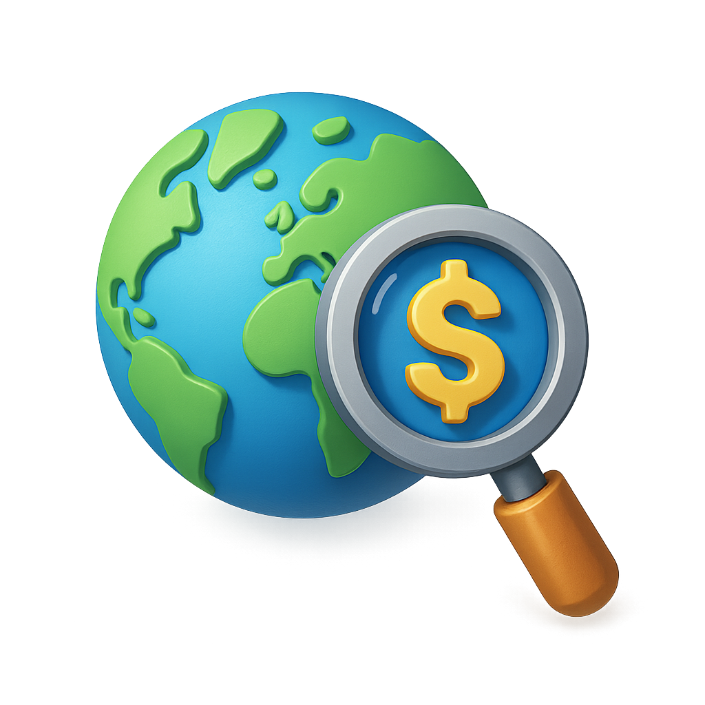 3D Globe with Magnifying Glass and Dollar Sign Icon