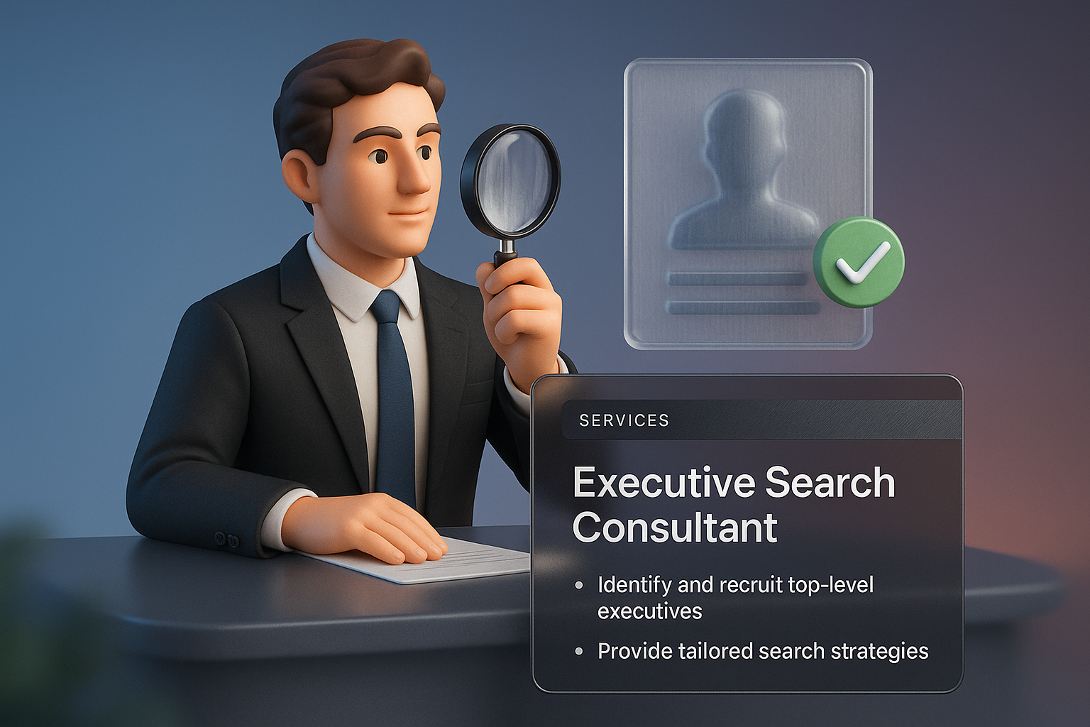 /Collection: /by davooda/Type: PNG/A 3D illustration depicting an Executive Search Consultant holding a magnifying glass. The design integrates a dark panel with service details, emphasizing recruitment expertise.