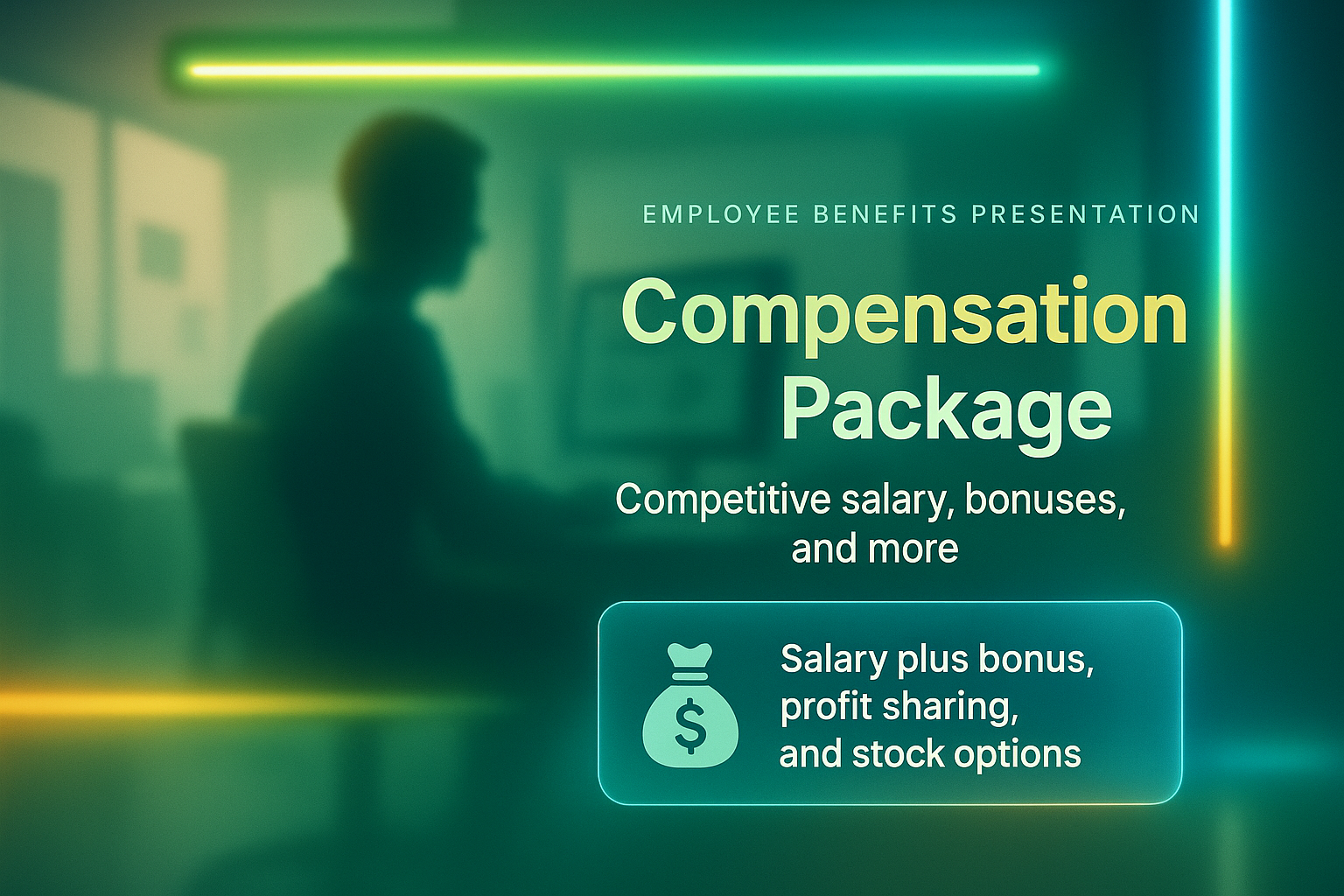 Professional presentation slide focused on employee compensation benefits, featuring a modern design with engaging visuals and text. Ideal for HR and corporate settings.