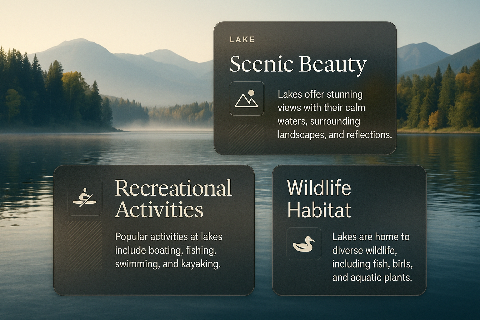 A serene lake scene featuring mountains in the background, complemented by stylish informational blocks highlighting scenic beauty, recreational activities, and wildlife habitat.