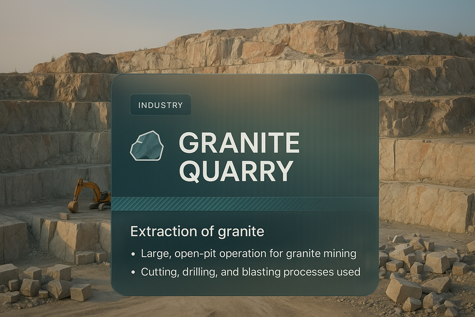 /Collection: /by davooda/Type: PNG/A detailed view of a granite quarry showcasing large stone blocks and mining machinery. An informative overlay highlights the quarry's industry and extraction processes.