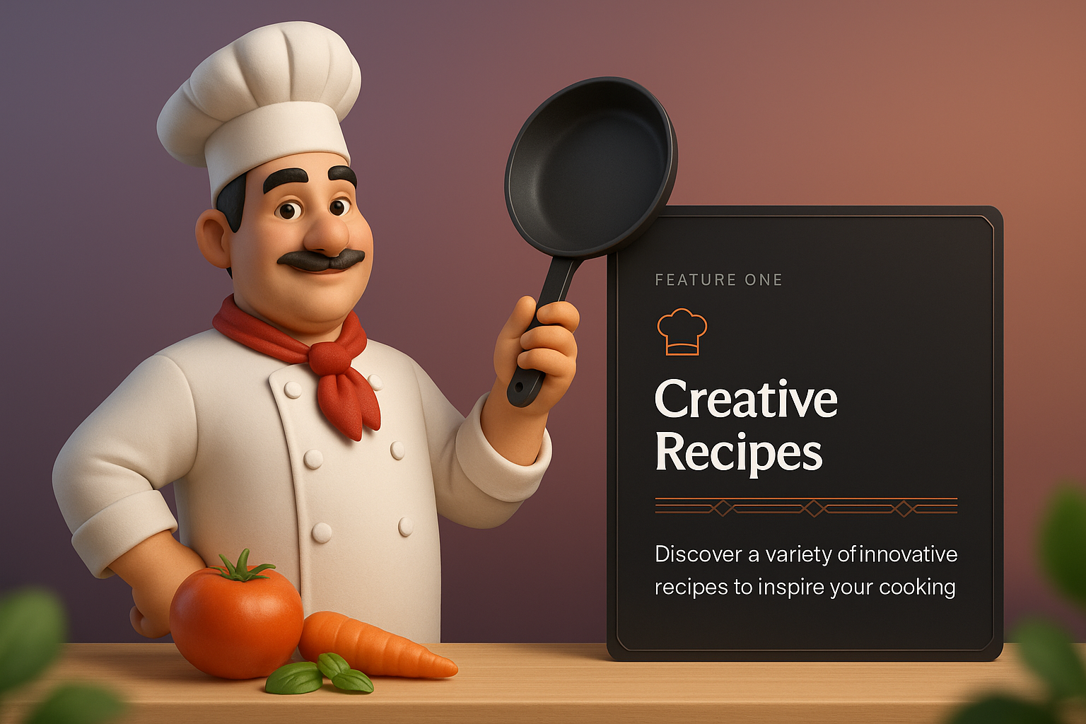 /Collection: /by davooda/Type: PNG/A 3D illustration of a cheerful chef holding a frying pan, surrounded by fresh vegetables. The chef is set against a smooth gradient background with a dark feature block highlighting creative recipes.