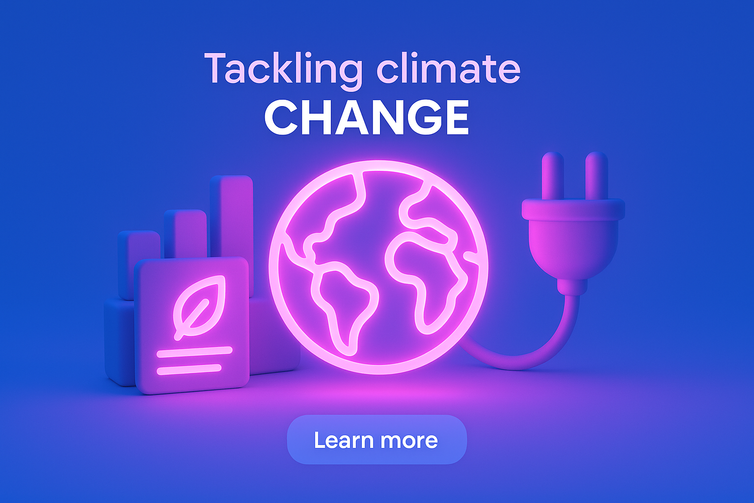/Collection: /by davooda/Type: PNG/This vibrant image features a glowing earth icon surrounded by elements symbolizing climate action, set against a solid blue background. The neon-pink glow enhances the atmosphere.