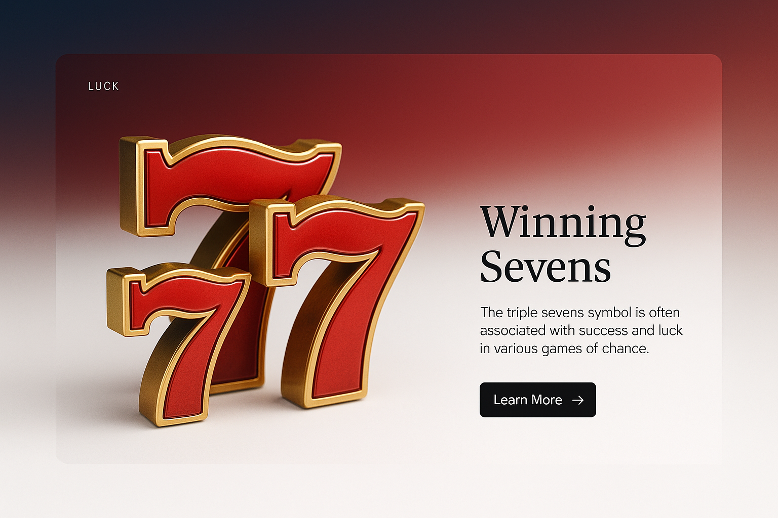 /Collection: /by davooda/Type: PNG/The image features a vibrant triple 7 symbol in red and gold, set against a gradient background transitioning from dark to white. It includes a text block about luck and an action button.