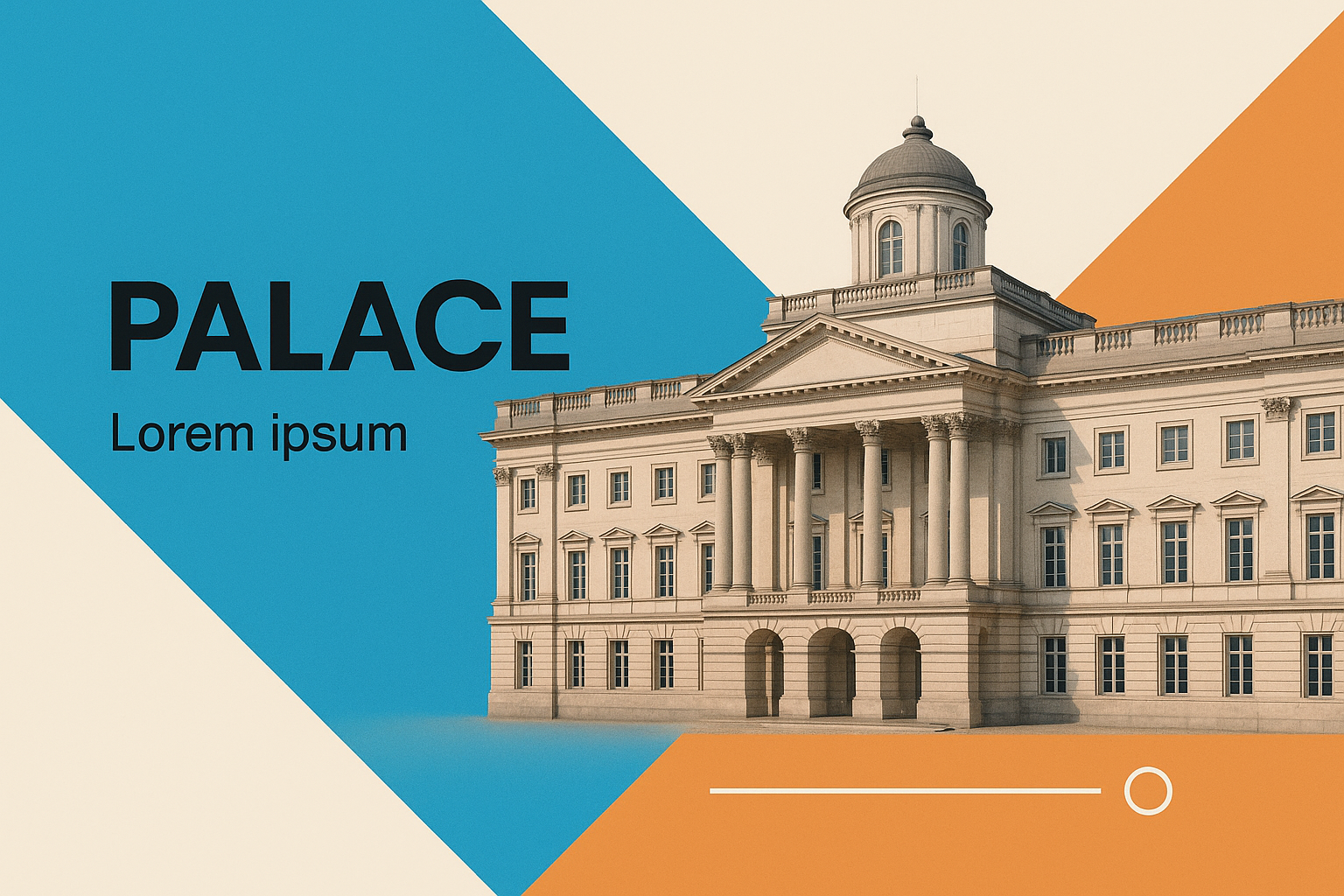 A clean, modern graphic layout showcasing a palace structure. The image features distinct color blocks with a minimalist aesthetic, emphasizing clarity and professional design.