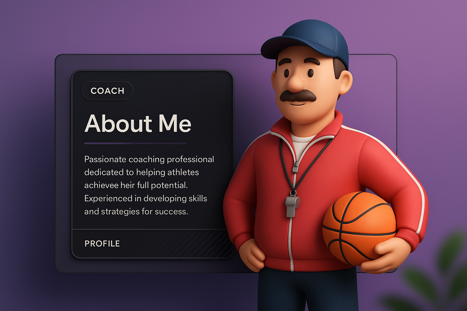 /Collection: /by davooda/Type: PNG/A vibrant 3D illustration of a coach holding a basketball, set against a smooth gradient background. The coach stands beside a dark panel containing an 'About Me' section showcasing their expertise.