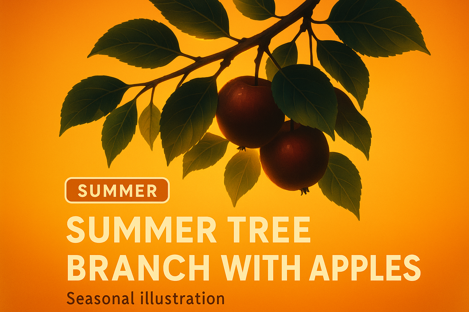 /Collection: /by davooda/Type: PNG/This seasonal illustration features a tree branch with apples against a warm gradient background. It serves as a decorative graphic suitable for summer-themed content.