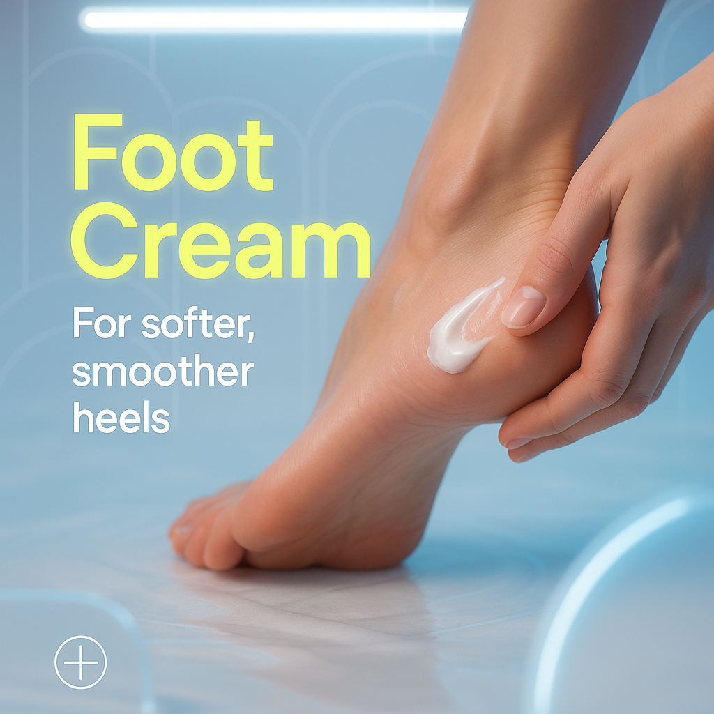 A promotional image showcasing a hand applying foot cream to a heel, featuring a soft, modern aesthetic. Ideal for skincare marketing.