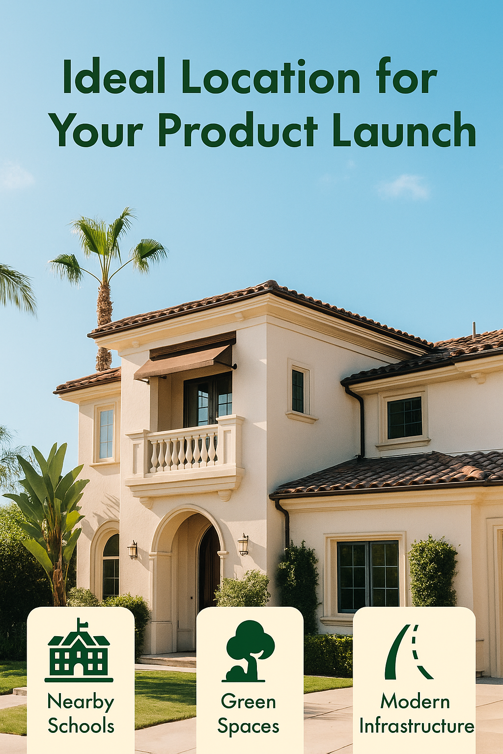 A visually appealing real estate promotional graphic showcasing the ideal location for a product launch, featuring modern architecture and essential amenities.