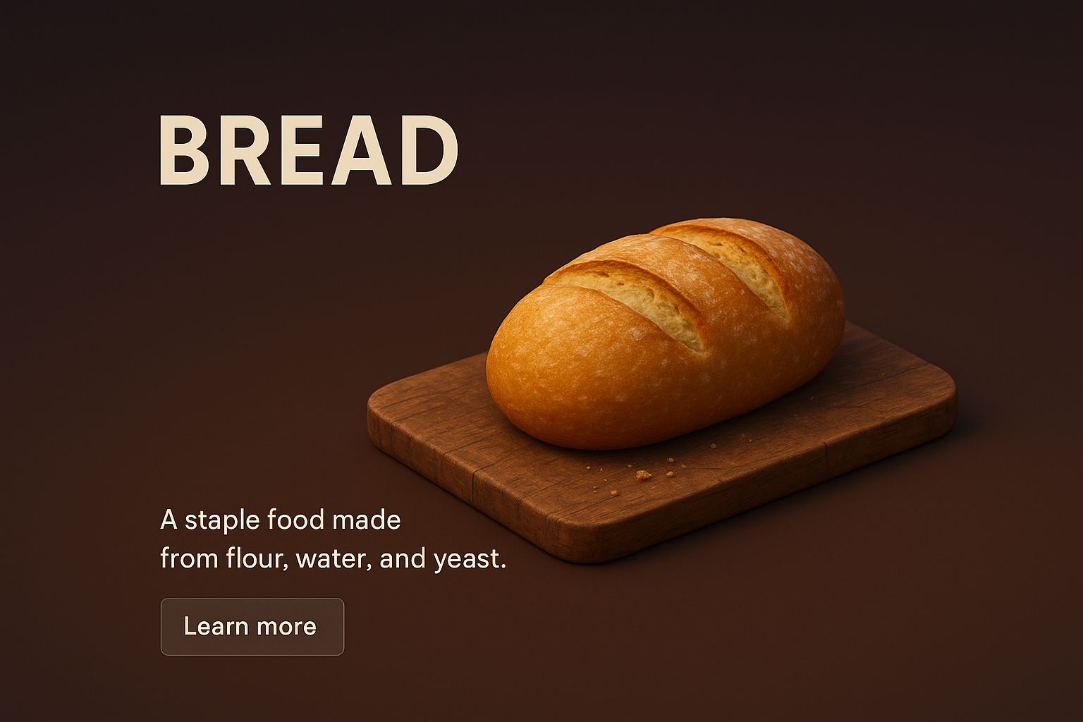 A realistic 3D depiction of a loaf of bread on a wooden cutting board. The background features a smooth gradient transitioning to a dark solid color, enhancing the loaf's texture and detail.