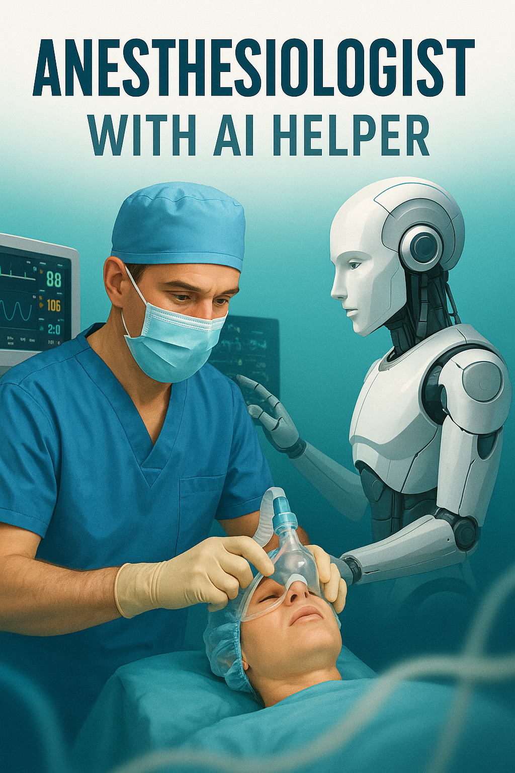 /Collection: /by davooda/Type: PNG/The image features an anesthesiologist in scrubs and a surgical mask assisting a patient with a futuristic AI robot. The background displays medical equipment, enhancing the realistic hospital environment.