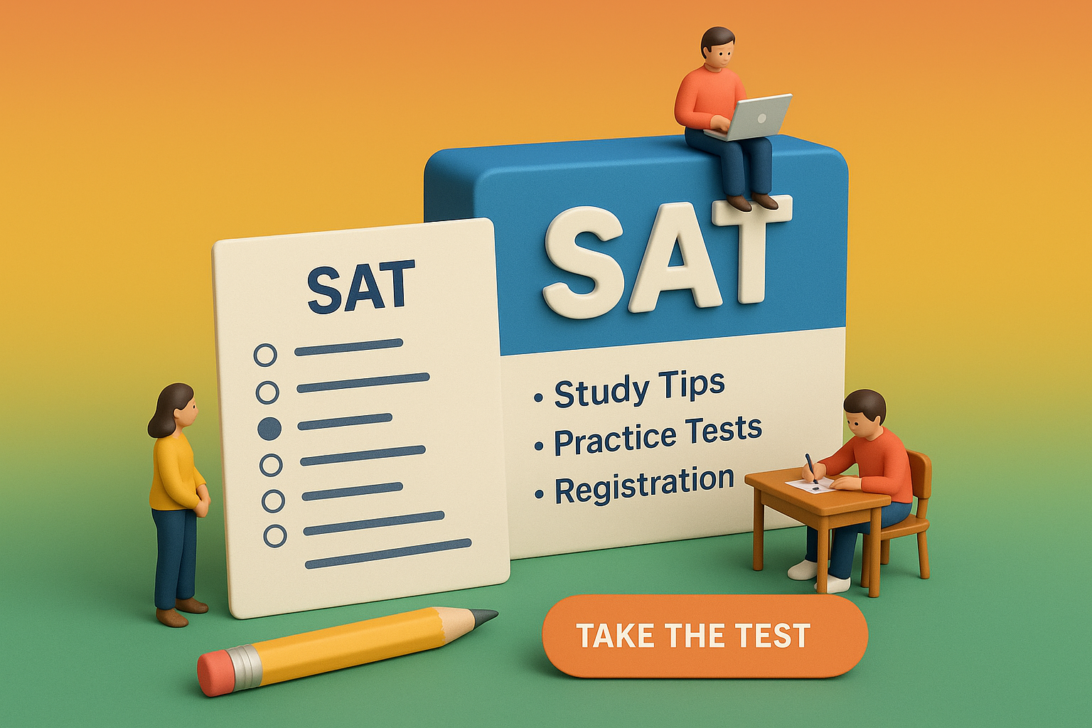 /Collection: /by davooda/Type: PNG/A vibrant 3D scene showcasing three miniature figures engaged in SAT preparation activities. The environment includes a bright gradient background with a focus on study tips and registration elements.