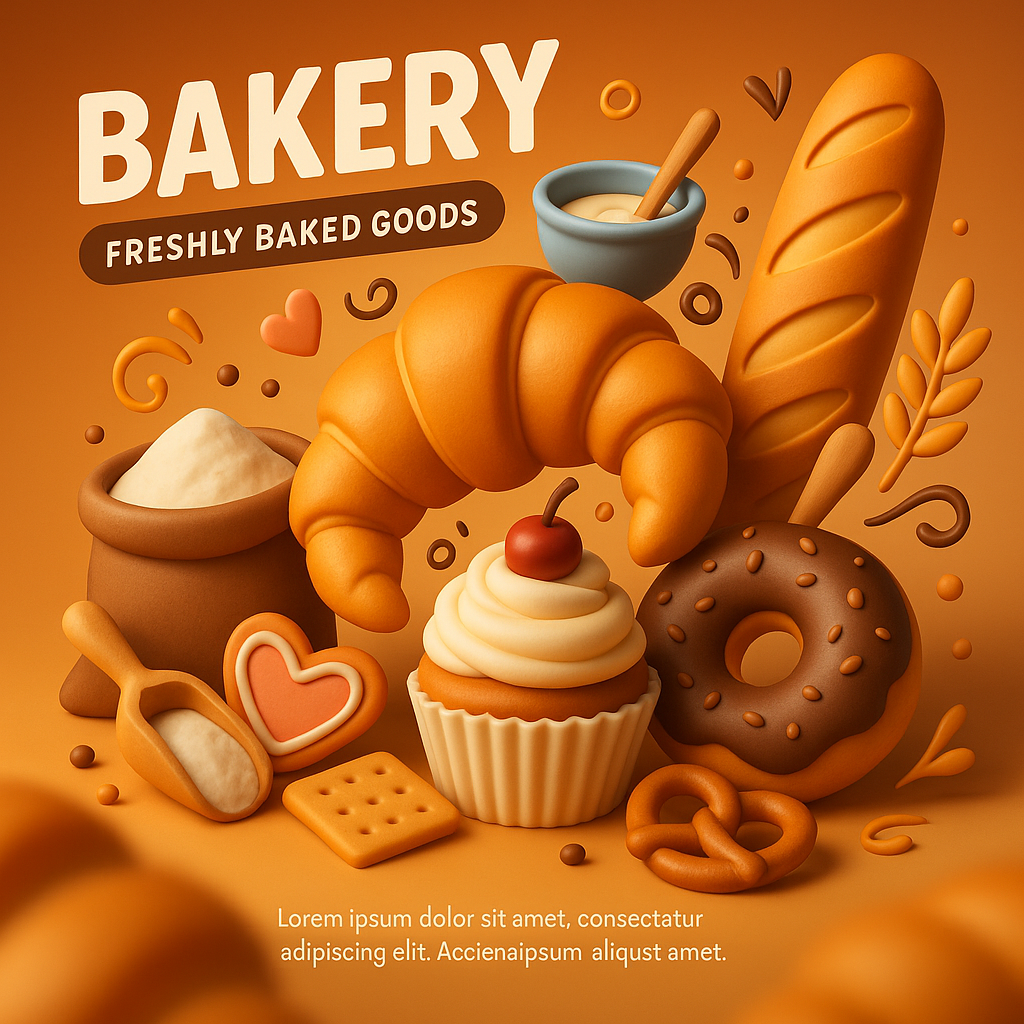 /Collection: /by davooda/Type: PNG/A vibrant and playful illustration showcasing a variety of freshly baked goods, perfect for bakery branding or promotional materials. The design is colorful with a whimsical style, making it appealing for food-related content.