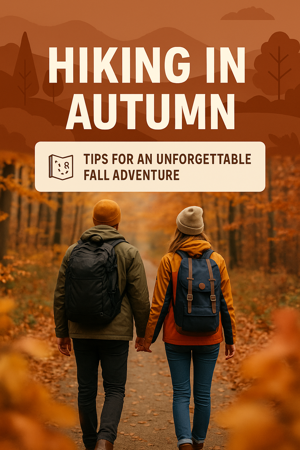 An informative graphic designed for outdoor enthusiasts, showcasing a couple hiking in a vibrant autumn setting. Ideal for promoting hiking tips and fall adventures.