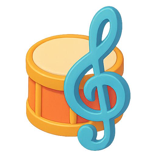 Fun and vibrant cartoon-style illustration featuring a drum and a treble clef, ideal for music-related content, apps, or educational materials.