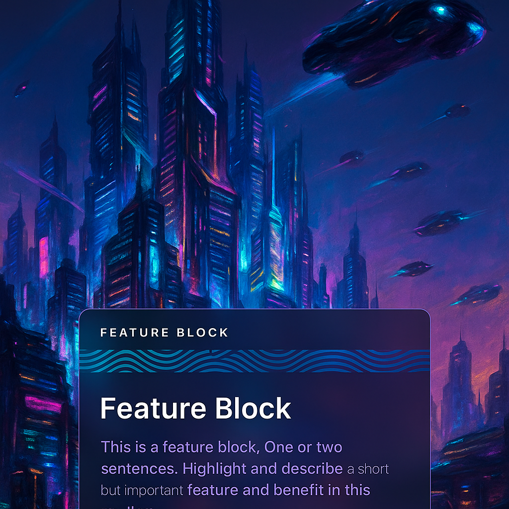 /Collection: /by davooda/Type: PNG/A vibrant cyberpunk cityscape at night, featuring towering skyscrapers, flying cars, and glowing neon lights. The scene is enriched by a feature block integrated into the artwork.