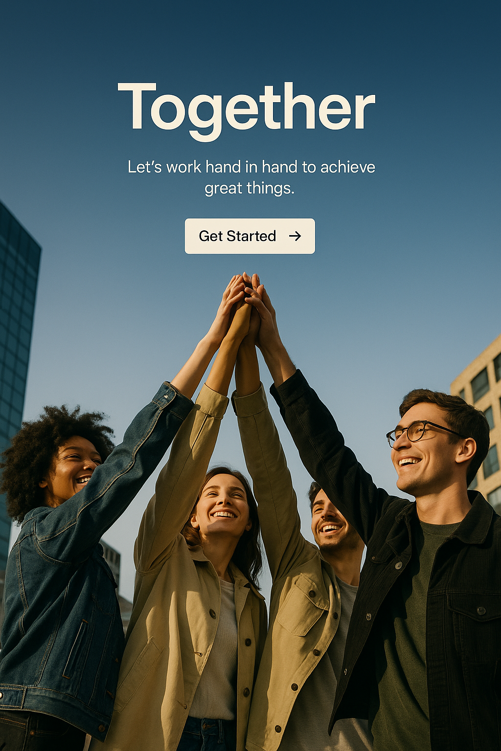 /Collection: /by davooda/Type: PNG/A diverse group of four individuals joyfully raising their hands together against a bright blue sky, symbolizing unity and collaboration. The scene conveys positivity and teamwork.
