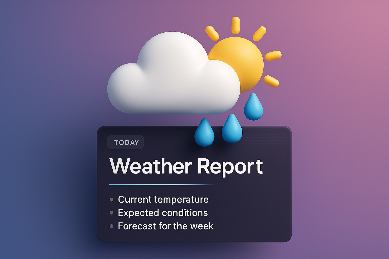 /Collection: /by davooda/Type: PNG/A visually striking 3D weather report featuring a cloud, sun, and raindrops. The design includes a dark panel with key weather information, set against a smooth gradient background.