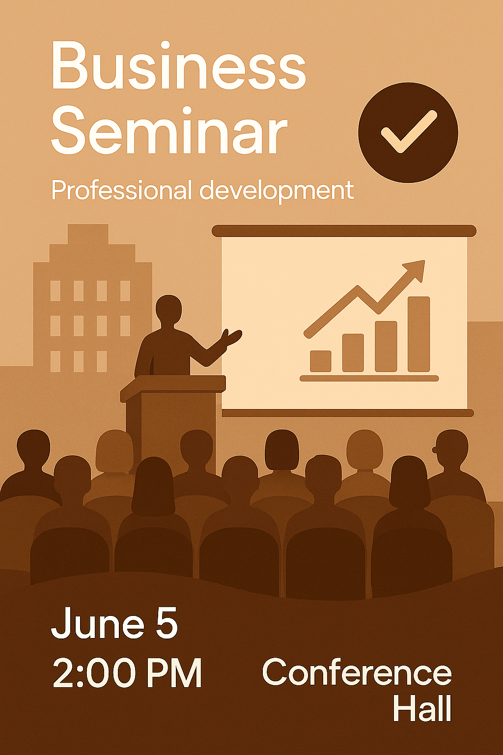 /Collection: /by davooda/Type: PNG/Informative promotional graphic for a business seminar showcasing a speaker, audience, and growth chart. Ideal for event marketing and professional development.