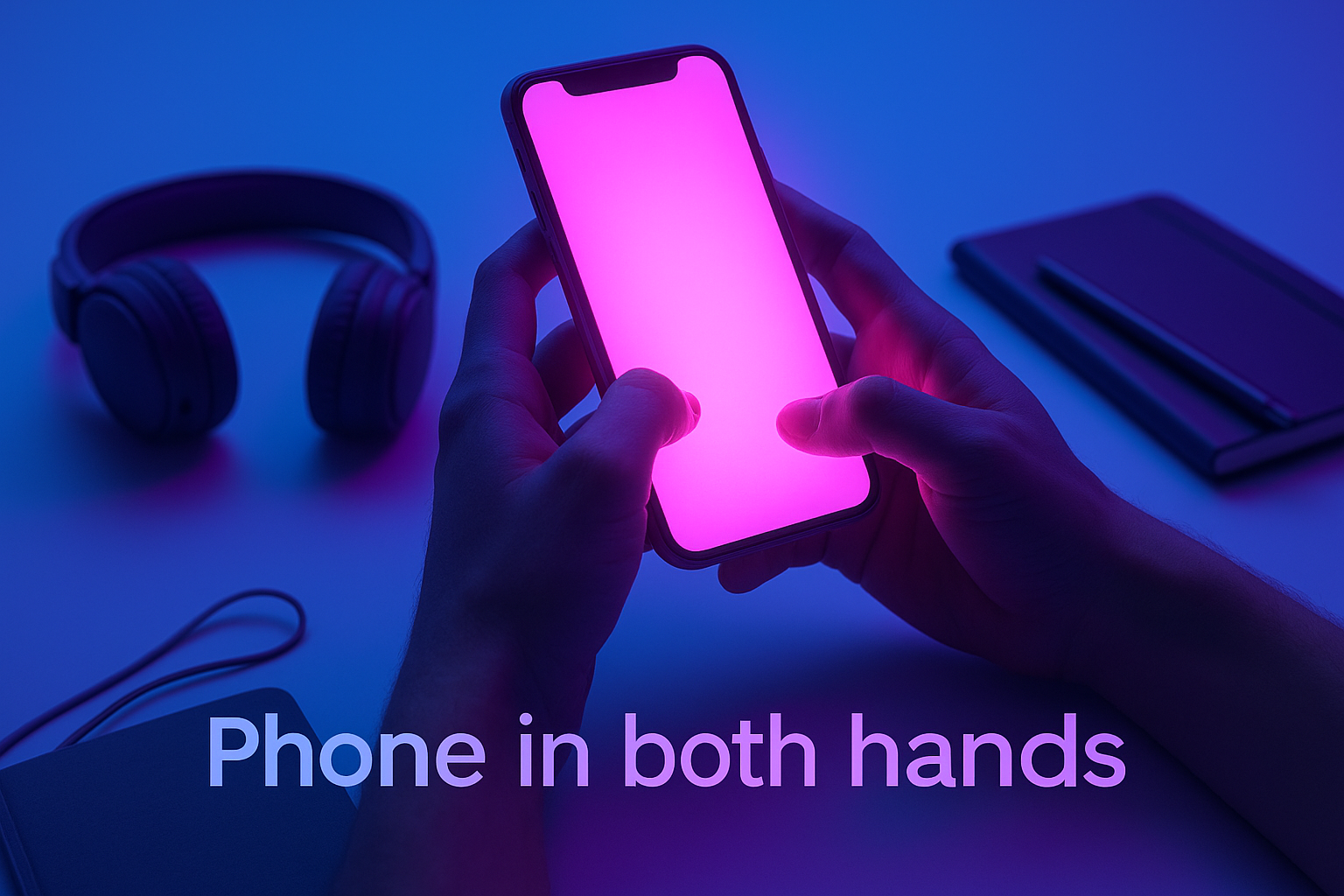 Neon Glow Phone in Hands with Vibrant Blue Background