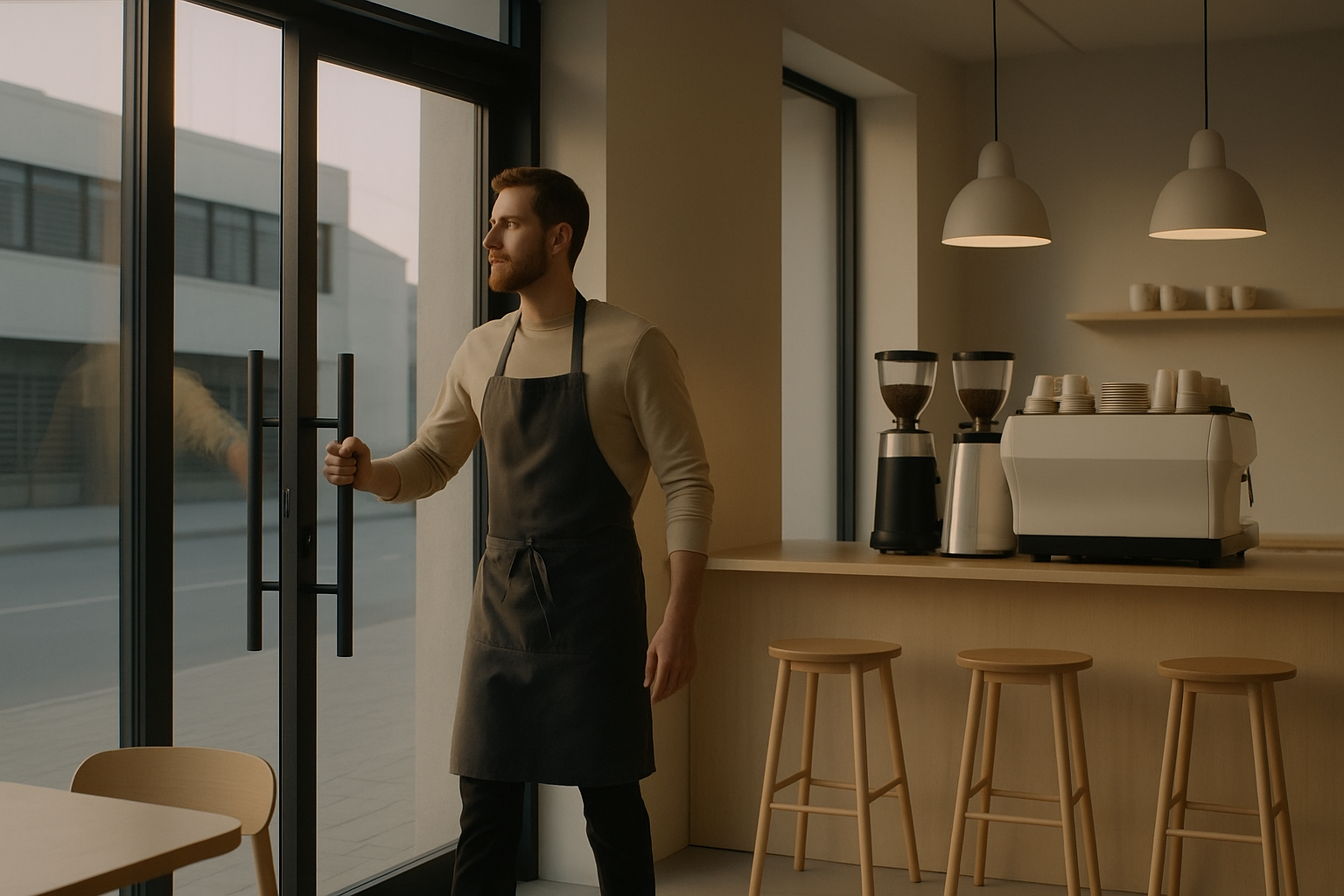A barista elegantly opens a cafe in the morning, showcasing a modern and minimalist interior. The warm lighting enhances the inviting atmosphere of the space.