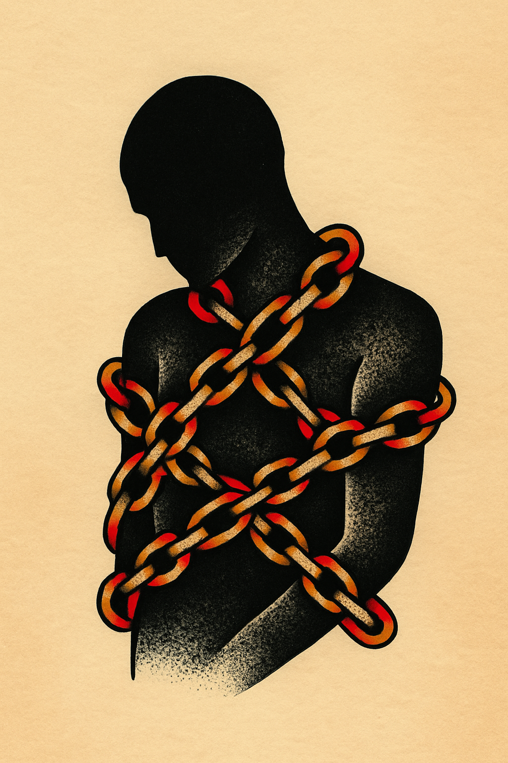 This image features a silhouette of a figure bound in intricate chains, designed as a tattoo. The chains are colored in vibrant hues against a soft beige background.