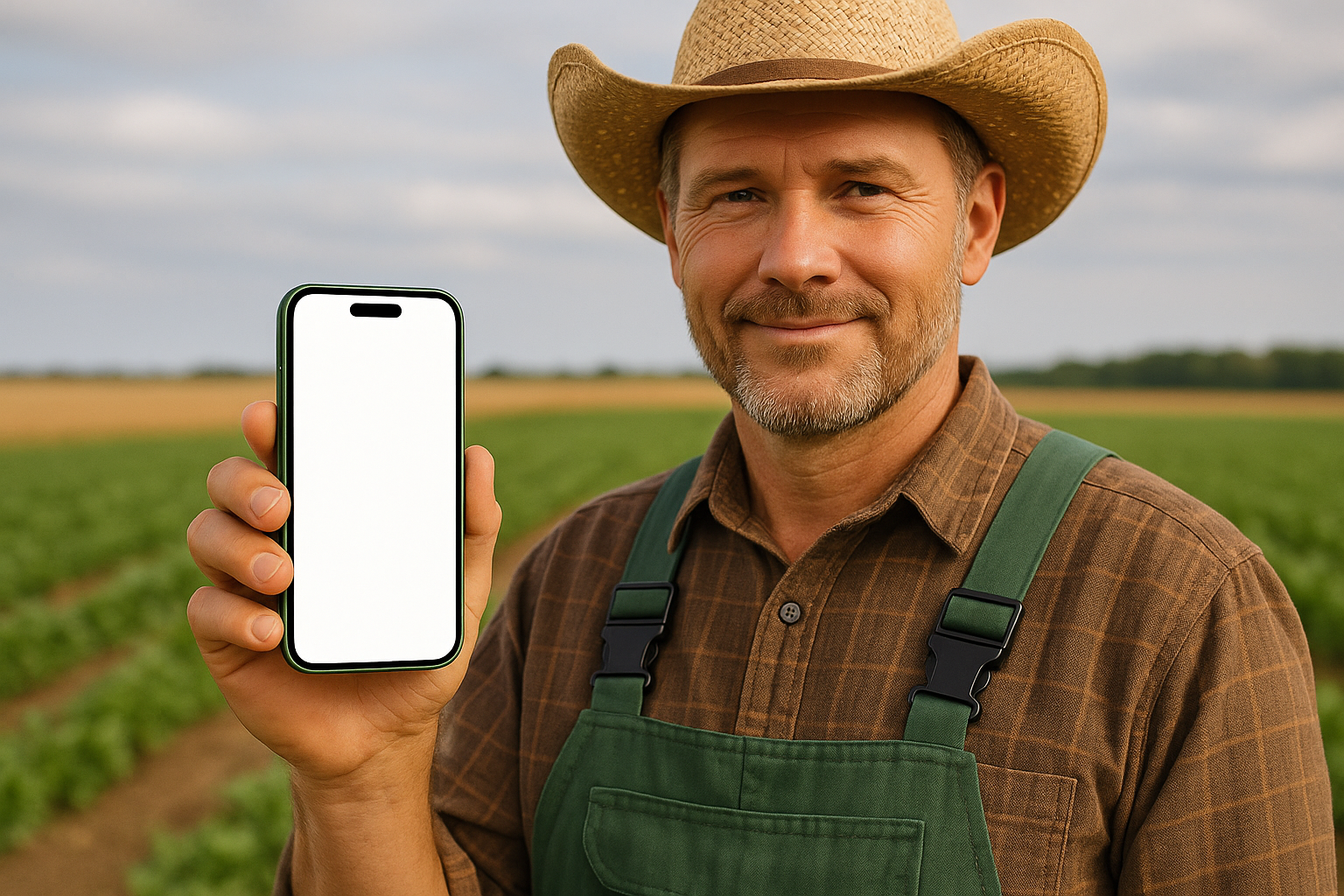 A farmer in overalls smiles while holding a green phone against a backdrop of lush fields. The phone features a blank white screen, emphasizing the rural setting.