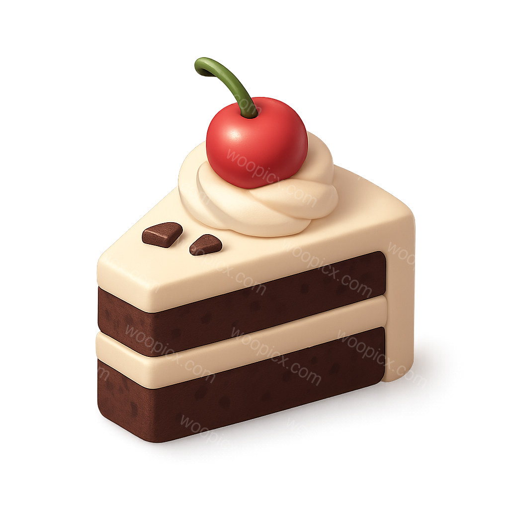 /Premium/Collection: /by davooda/Type: PNG/A visually appealing 3D icon of a slice of Black Forest cake, featuring creamy layers, chocolate, and topped with a cherry. The cake is presented in a three-quarter isometric view with a transparent background.